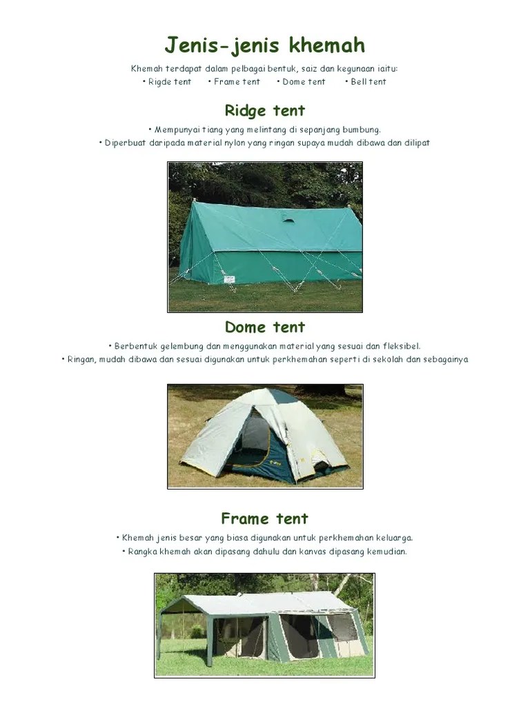 Frame tent khemah rangka besar / jenis besar biasa digunakan . Di bawah ini adalah beberapa jenis . Tanpa khemah anda tidak boleh berkhemah. Perkara paling asas dalam rekreasi luar ini ialah perkhemahan. Khemah untuk perkhemahan rekreasi jatuh ke dalam dua kategori. Dalam lain perkataan khemah merupakan satu perkara utama dalam aktiviti berkhemah. Kini aktiviti berkhemah mula menjadi trend kepada netizen di malaysia. Ringan, mudah dibawa dan sesuai digunakan untuk perkhemahan seperti di sekolah dan sebagainya. Boleh dikatakan setiap lokasi dan kawasan perkhemahan sentiasa penuh . Rekreasi luarpendidikan jasmani dan kesihatan tahun 4cara pasang khemah. Khemah yang digunakan oleh "penyandang belakang" adalah jenis yang paling .